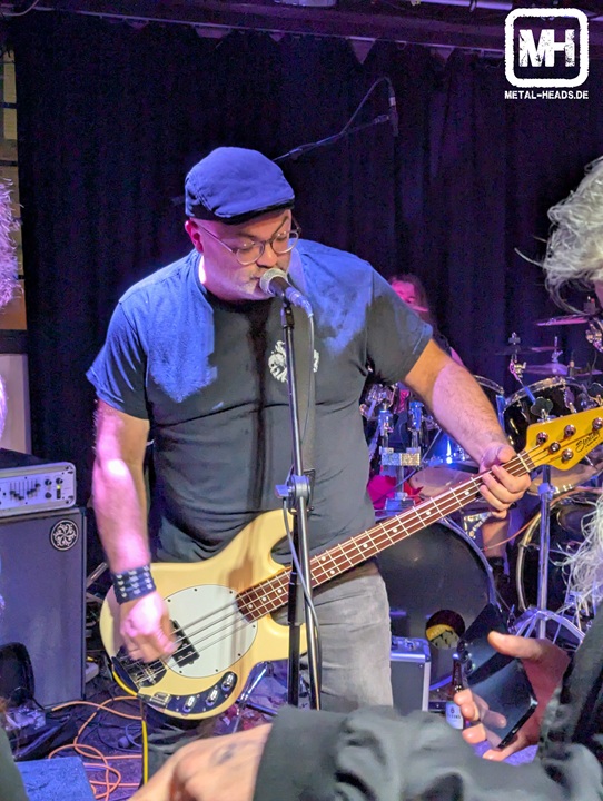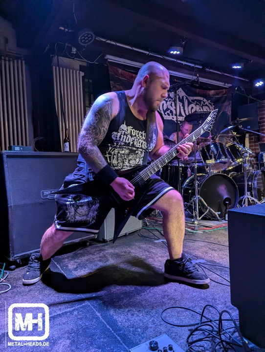 Da die beständigen NRW-Helden von New World Depression sich durch fleißige Live-Aktivitäten und qualitativ hochwertige Veröffentlichungen mittlerweile einen kleinen Kultstatus in der Region erarbeitet haben, waren sie die heimlichen Headliner an diesem Abend. Live-Kracher wie „Burning Down“, „Skull Carver“ und „Working with Flesh“ funktionierten in dem kleinen Raum hervorragend, der Sound war mächtig und Fronter Hütte gab sich alle Mühe die anwesenden Death-Metal-Freaks mitzureißen, was aber leider nur sporadisch gelang. Die Bühne in der Schmiede ist für das Quintett aus dem Münsterland aber sowieso mittlerweile viel zu klein, die gehören aufs Partysan. Und Hütte ist der deutsche John Tardy, nicht nur seines Shirts wegen!