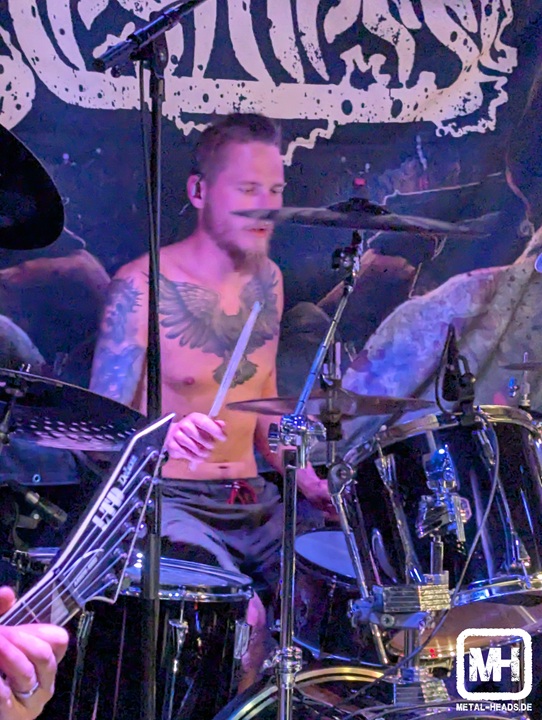 Danach war die tschechische Death/Grind-Institution Fleshless an der Reihe. Sie als Headliner ranzulassen macht Sinn, da sie mit Abstand die Dienstältesten heute Abend waren (erstes Demo von 1993!). In den Neunzigern und frühen 2000ern haben sie noch hauptsächlich sehr grindcore-lastigen Death-Metal gespielt, die Grind-Anteile aber auf späteren Platten zugunsten technisch komplexerer Strukturen reduziert. Dennoch liefern sie das volle Hackbrett ab und setzen die Schmiede unter ein Sperrfeuer aus irrwitzigen Tempiwechseln, rabiaten Breaks und den erwähnten Grind-Ausflügen. Nicht zu frickelig, sondern immer nachvollziehbar und abwechslungsreich. Der ungarische Drummer Balász wusste mit technisch beeindruckendem Geknüppel und eigenständigem Stil zu begeistern. Nach den beiden Tracks der letztjährigen „Voluntary Lobotomy“-Single folgte der Brückenschlag zum Bandklassiker „Nice to eat you“, der von Shouter Vladimir mit den Worten „If you don´t know this one, you don´t know us“ angekündigt wurde.