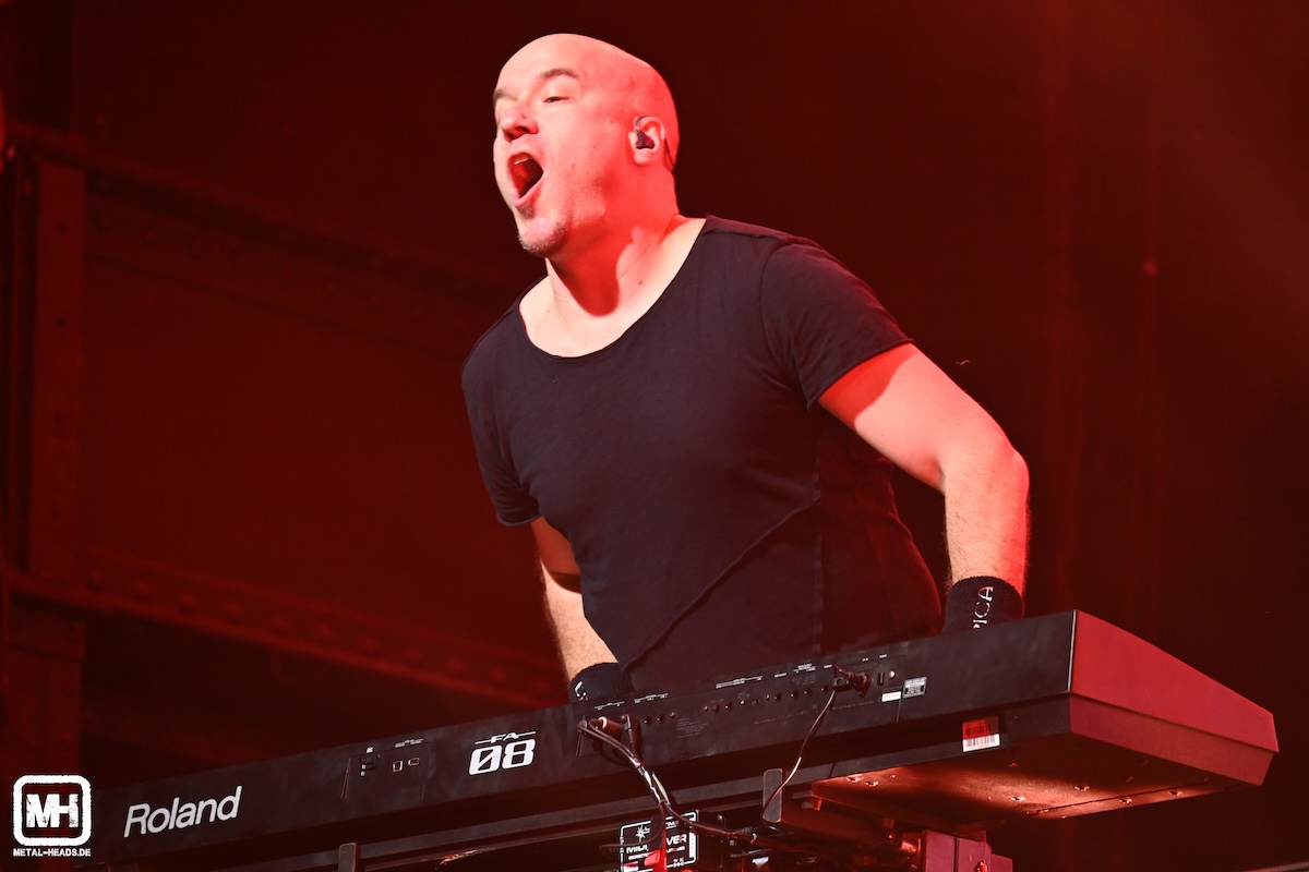 Um 19.50 Uhr – und damit nur knappe 10 Minuten später als geplant – eröffnet mit Epica der erste der beiden Headliner die 2026´er Tour. Und wie. Die Band nutzt eine gigantische Video-Leinwand auf der Bühne und nachdem ein stilisiertes Gesicht auf amüsante Weise ein paar Eingangsworte zur Intro gesprochen hat, legen Epica mit dem Opener „Apparation“ aber mal so richtig los. Die vom bestens gelaunten und überaus aktiven Keyboarder Coen Janssen als „beste Sängerin der Welt“ vorgestellte Frontfrau Simone Simons hat – eigentlich wie immer – einen stimmlichen Sahne-Tag erwischt. Und zelebriert sich durch das 80-minütige Set. Wobei gerade auch Keyboarder Coen aus dem sehr homogenen Bandgefüge nicht nur wegen seines „Umhänge-Keyboards“ der Marke Uwe Fahrenkrog-Petersen (genau, der von NENA) irgendwie besonders hervor sticht (siehe Bild).