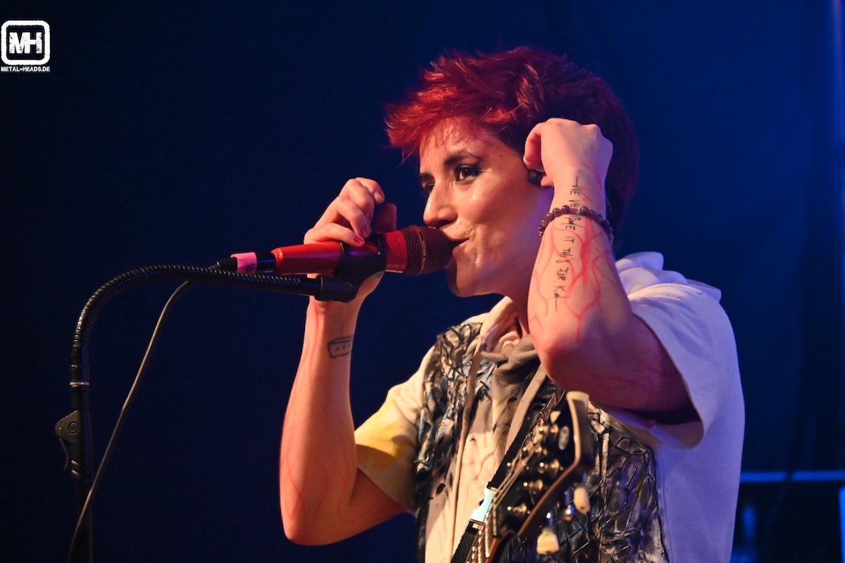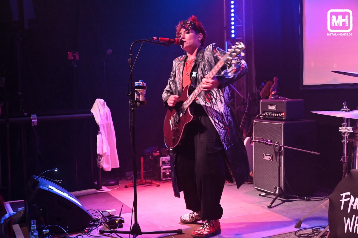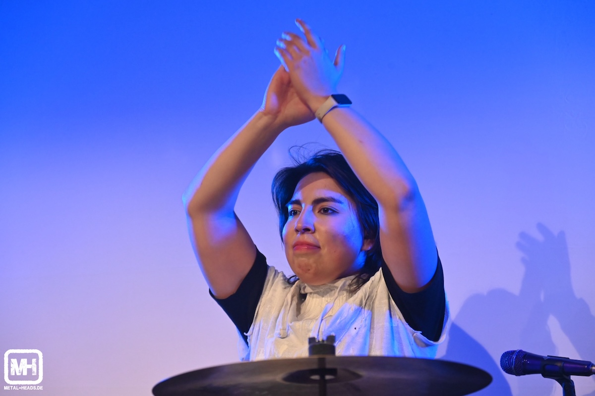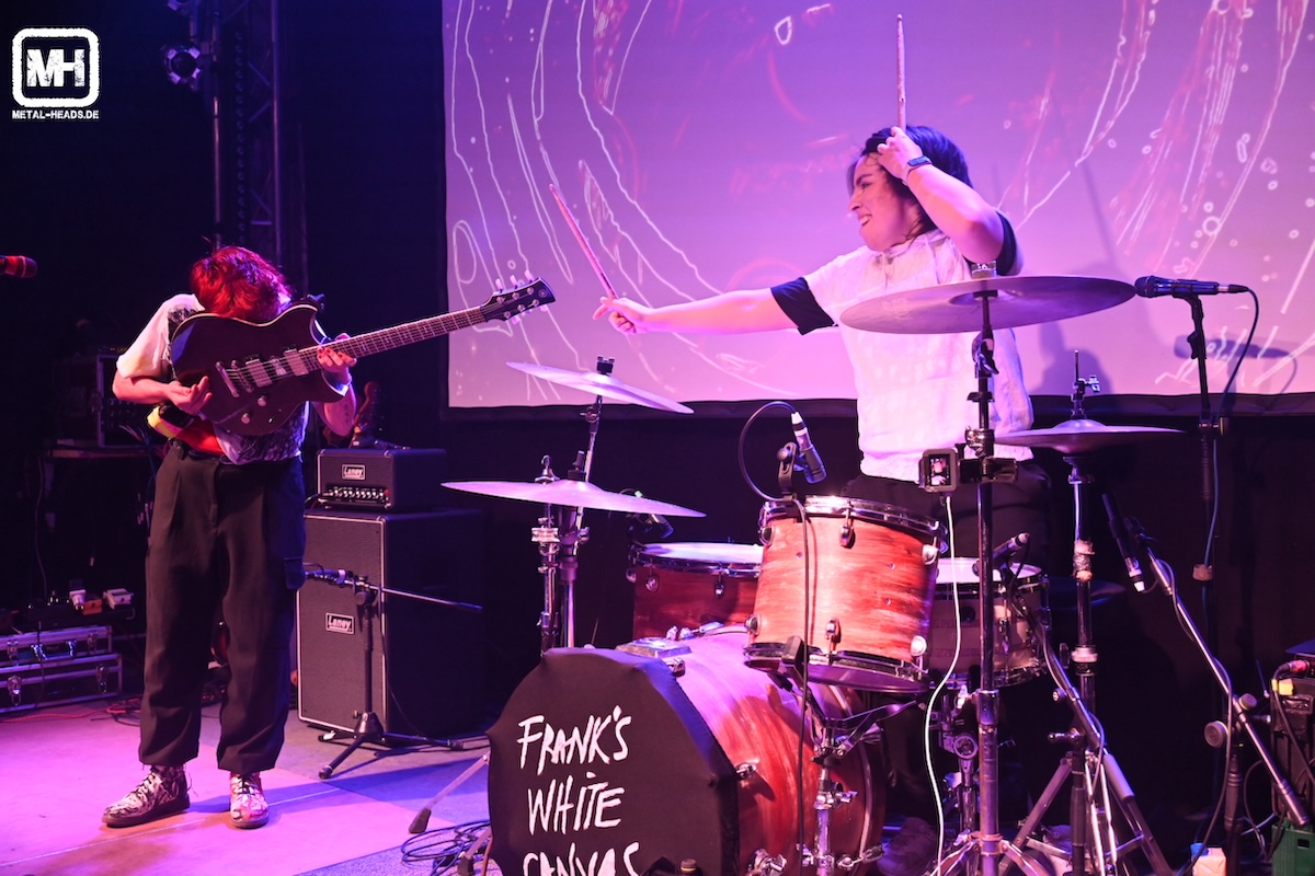 Heute Abend starten pünktlichst um kurz vor 20.30 Uhr die beiden gebürtigen Chileninnen von FRANK´S WHITE CANVAS. Sängerin und Gitarristin Karin Aguilera sowie Schlagzeugerin Francisca Torés Leiva, die inzwischen nach Berlin umgezogen sind, machen von Beginn an so richtig Alarm hier. Und man merkt: Hier sind Profis auf der Bühne. Nein, vielmehr: echte Künstler*innen. Denn die Musik, die eigens kreierten Bühnen-Outfits (die zwischenzeitlich auch noch gewechselt werden) sowie die bestens auf die Songs abgestimmten Video-Leinwand-Hintergrund-Animationen gehen so fließend ineinander über, dass es eine wahre Freude ist.