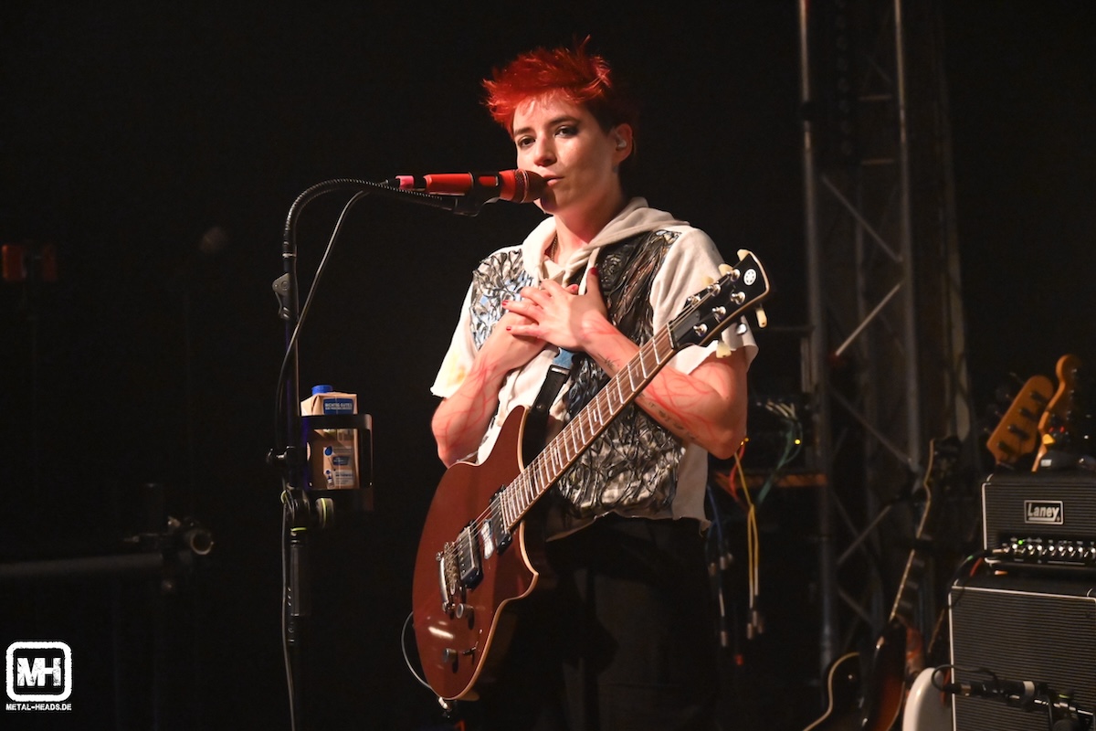 PREYRS – hervorgegangen aus dem gemeinsamen Projekt der anfänglich unter ihrem eigenen Namen performenden Künstlerin Amy Montgomery und ihrem Produzenten Michael Mormecha sowie den beiden weiteren Bandmitgliedern – spielen an diesem Abend neben alten Tracks wie „Astil“ auch viele neue Songs vom Debüt-Album der Band, dass da „The Wounded Healer“ heißt. Ein Wort zu Michael: Der Multi-Instrumentalist bespielt nicht nur die Trommelfelle an diesem Abend. Nein, bei zwei Songs greift er höchstselbst zur Gitarre und singt auch noch. Und dies richtig, richtig gut. In der Zwischenzeit übernimmt Gitarrist Nolan halt die Drums. Und macht dies auch richtig, richtig gut. Was ein Hin und Her, was für eine Abwechslung auf der Bühne. Einfach großartig. Als Michael dann fast übermütig mit der Gitarre auf die Bassdrum steigt (siehe Foto unten in der Fotostrecke), reißt er sich beim Sprung danach das Kabel aus dem geliehenen Saiteninstrument und ist anschließend nicht mehr zu hören. Man sieht ihn verzweifelt auf dem Boden an der Pedal-Station rumkrabbeln wie er versucht, das Problem irgendwie wieder in den Griff zu bekommen. Sängerin Amy kommt hierüber kaum aus dem Lachen raus…Apropos Amy.
